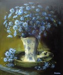 2007Herfstasters in deftsblauwe vaas met schaal