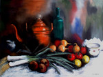 2008Stilleven met roodkoperen ketel met groeten en fruit.